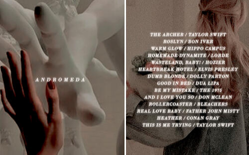 name. andromeda presley.nickname. dromeda, annie, meda, elvis.age. 25 ( verse dependent ).gender. cis female.sexuality. bisexual.body. athletic, slender.hair / eye color. blonde + dirty blonde / brown.height / weight. 5'4 / 125 lbs.AESTHETICS dainty layered necklaces / southern accent / warmth of the sun / sundresses / smell of the earth and lilacs / bright eyes / music playing from the other room / driving fast with the windows down / dancing with your friends until you can’t stand / sharp arrows / petting every animal you come across / southern hospitality / longing glances / picking flowers for a friend / mom jeans and tank tops / kind expression / loving so hard your chest aches